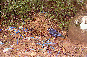 Before I had visited Australia I had been delighted by two nature documentaries produced by David Attenborough shown on PBS. Upon arriving in Australia at O'Reilly's I was delighted to learn that these docmentaries had been filmed on the very grounds where I was  staying! One of the animals featured in these productions was the story of a Satin Bower Bird. The Bower Birds have the peculiar habit of building an arched-shaped bower of twigs to attract a mate. The Satin Bower Bird in particular then carefully arranges articles he has collected that are all  blue  in color. I was pleased to see the very Satin Bower Bird named Jock shown in the documentaries. Jock was most obliging, he showed us how he would re-arrange his blue articles in front of his bower (after our guide moved one of the articles, putting it  inside the bower--a no-no for Jock!).